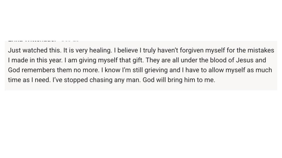 Hearing his name and feeling nothing Deleting the screenshots without re-reading them Looking in the mirror and seeing the woman God created, not the one he left Waking up excited about your life again Praying about your future instead of replaying your past Pursuing covenant love without emotional residue